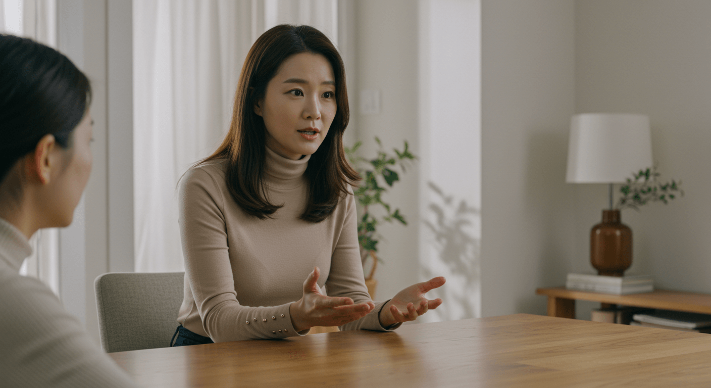 감정을 조절하며 단호하게 경계선을 그으며 대화하는 여성