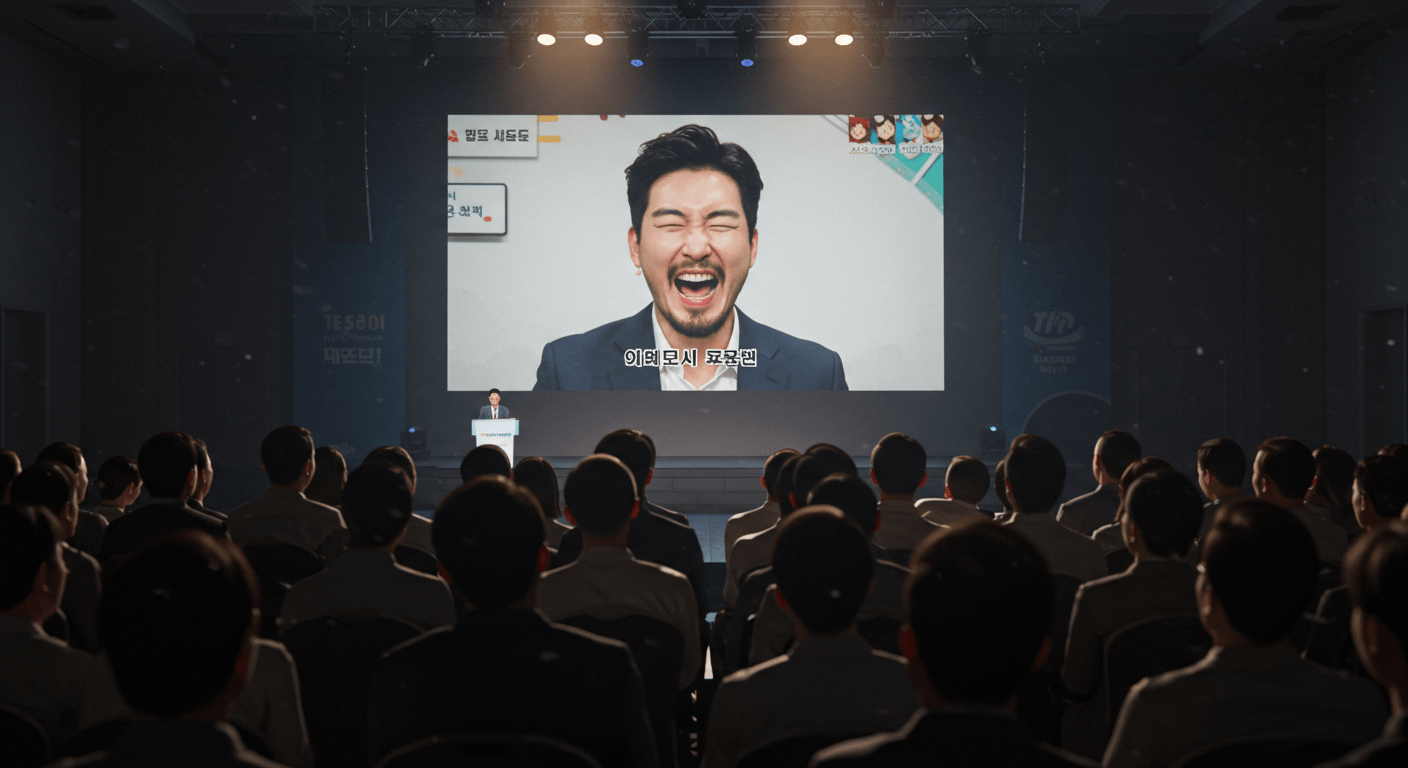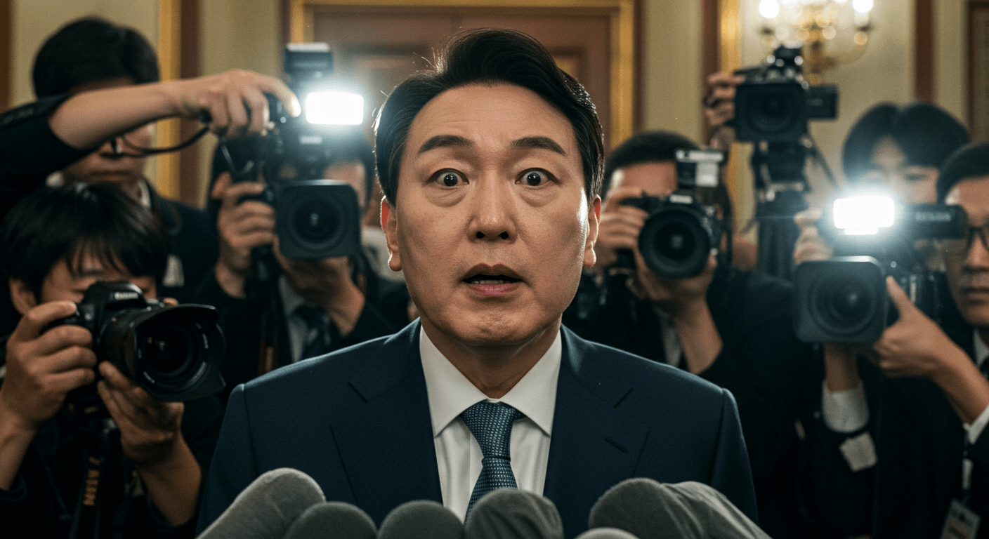 통제력을 잃고 당황한 인물의 표정과 기자회견 현장