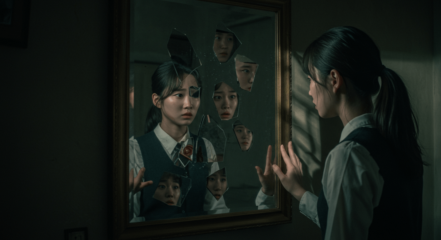거울 속 다양한 감정으로 분열된 자아를 바라보는 사람