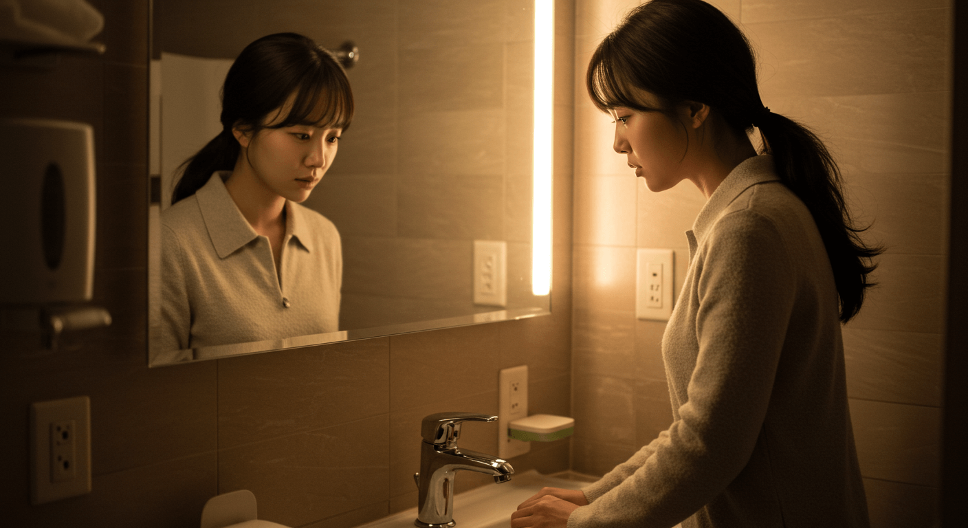 거울 앞에서 감정을 억누르는 여성의 모습