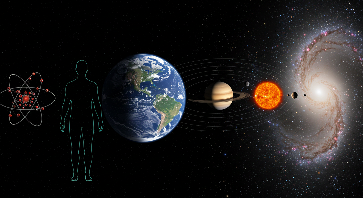 양자 입자 < 인간 < 지구 < 태양계 < 은하 < 은하단 < 관측 가능한 우주