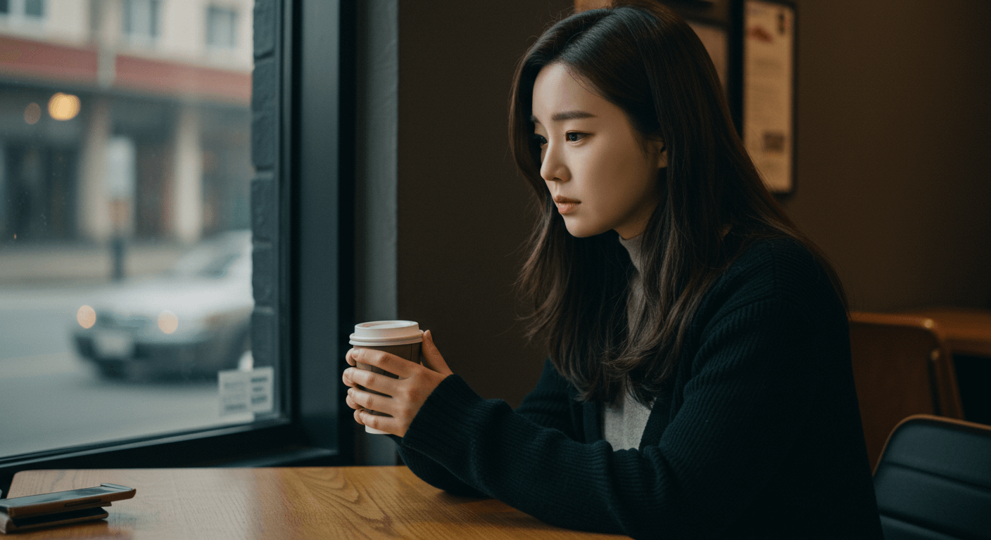 "카페에서 외롭게 앉아 생각에 잠긴 여성"
